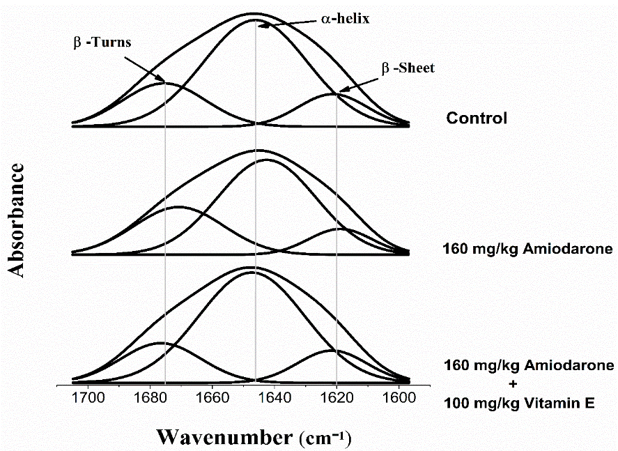 Results: The results obtained from the FTIR spectrum revealed that the short-term administration of amiodarone caused a significant alteration in the stretching NH-OH region. A newly detected component centered at 3739±1 cm-1 was assigned as strO-H. There was a significant decrease (p˂0.05) in the bandwidth and band position of one component of strO-H that centered at 3598±1 cm-1. Moreover, remaining vibrational bands (O-Hasym and O-Hsym) were shifted to higher frequencies. Coadministration of vitamin E with amiodarone reduced the contour to four components as a control with significant increase in the band position of O-Hasym and the bandwidth of one component of str O-H. Amiodarone administrations lead to reducing the area ratio of asymCH2 to symCH2 and elevation of the area ratio of asymCH2 to asymCH3 while the coadministration of vitamin E returned it as the control ratio. The percentage of the β-turn was significantly increased while the α-helix content was decreased due to amiodarone. The contents of both components were considered mimicking the control values when Vitamin E was co-administered with amiodarone.