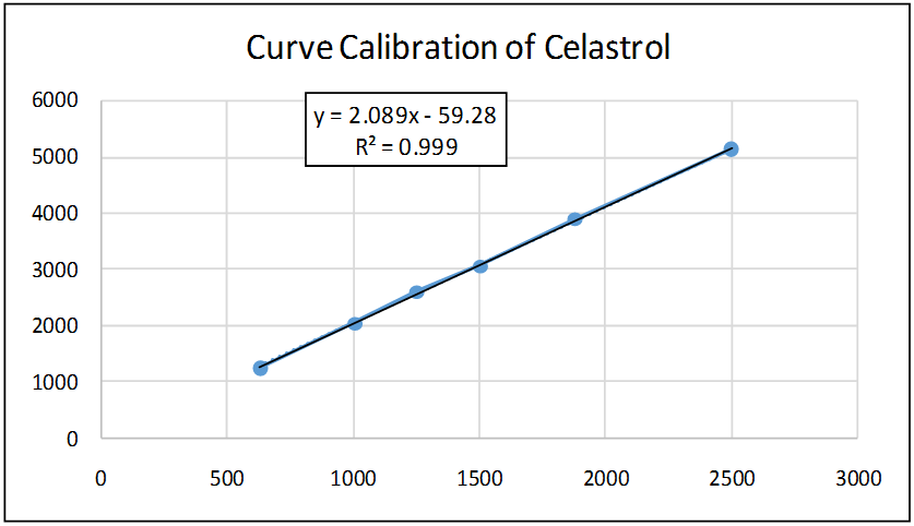 The HPLC mobile phase was HPLC-grade acetonitrile: 0.1% formic acid in water at 85:15, injection volume of 20 µl, and flow rate of 1 ml/minute. The celastrol concentrations for the calibration curve ranged from 0.031 ppm (lowest concentration of the dose to be developed into a nanoemulsion to 2.5 ppm.
