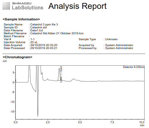 Preliminary testing involved identifying the purity of the celastrol standard and celastrol samples. By performing HPLC on a Shimadzu® LC 20 AT HPLC instrument using a SunfireTM C18 column (5 µm, 4. 6 x 250 mm), and a ultraviolet absorbance detector. at a wavelength of 230 nm.