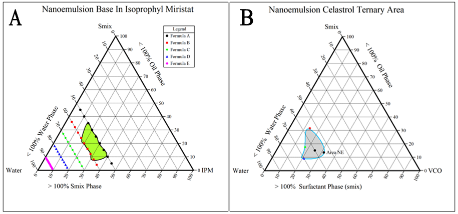 Fig. 4: Pseudo-ternary diagram of the nanoemulsion based preformulations using A. IPM and B. VCO oil phases