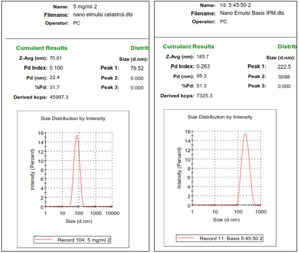 After the celastrol nanoemulsion formulation was selected on the basis of the preformulation, the characteristics of the celastrol nanoemulsion preparations with each of the two oils were analyzed. The results of these tests are presented in table 2 and fig. 5. It can be seen that for the celastrol nanoemulsion with the VCO oil phase, the average particle size is 70.81±0,20 nm, D90 of 120±3,46 nm, with a PDI of 0.1±0,03 and a zeta potential of −50.2±0,60 mV. For the celastrol nanoemulsion using IPM as the oil phase, the average particle size was 186.23±3, 12 nm, with a D90 of 117±1,0, PDI of 0.2±0,07, and a zeta potential of −45.5±1,10 mV. The other formulations showed varying particle sizes with some prerequisite characteristics for nanoemulsion preparations that did not meet the appropriate criteria, so those formulations were not selected [20, 21].