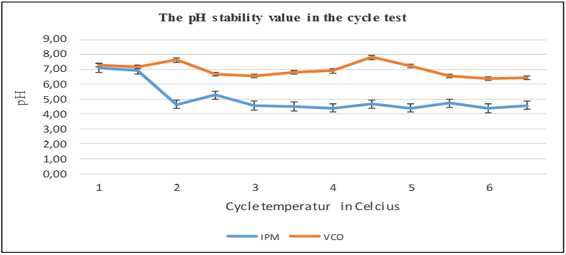 For the examination of nanoemulsion preparations from the two oil phases, the physical appearance of the two preparations did not show a striking difference in the white and slightly yellow color due to the celastrol compound as the active pharmaceutical ingredient. The odor did not show a rancid odor for 12 experimental cycles, and the preparation was not sticky to the touch. However, the first pH measurements were 7.6 for the nanoemulsions using IPM and 6.8 using VCO. Furthermore, the pH values of the two preparations were different, and both tended to decrease in the pH range of 4.5 6.0 over the 12-day daily testing can be seen fig. 6.