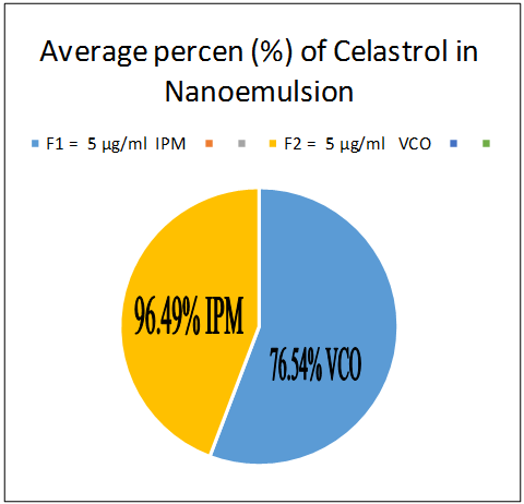 The absorption efficiency of celastrol in the nanoemulsion preparations was tested by the direct method. The recovery test for the celastrol compound from the two nanoemulsion dosage forms gave IPM levels of 96.49% for IPM and 76.53% for VCO (fig. 9) [27].