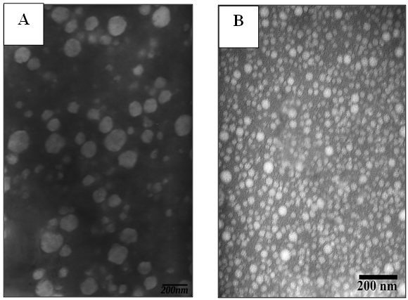 Fig. 10: TEM images showing the morphologies of the two celastrol nanoemulsions (A) IPM and (B) VCO