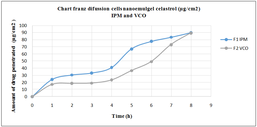 The in vitro profiles of Franz diffusion cells showed moderately good penetration rates for the IPM and VCO nanoemulsions. The results of the analysis show that the IPM nanoemulsion was slightly superior to the VCO nanoemulsion (fig. 11). At 20 and 24 h, the penetrated celastrol levels were 2.4 µg/ml/gram and 2.5 µg/ml/gram, respectively, for IPM and 2.0 µg/ml/gram and 2.4 µg/ml/gram, respectively, for VCO. Both nanoemulsions show fairly good ability to penetrate is zero order, so it is hoped that the levels of the active pharmaceutical ingredients will also be higher and maintained according to the desired therapeutic level. Thus, the nanoemulsion formulation for the delivery of celastrol is recommended for further research.