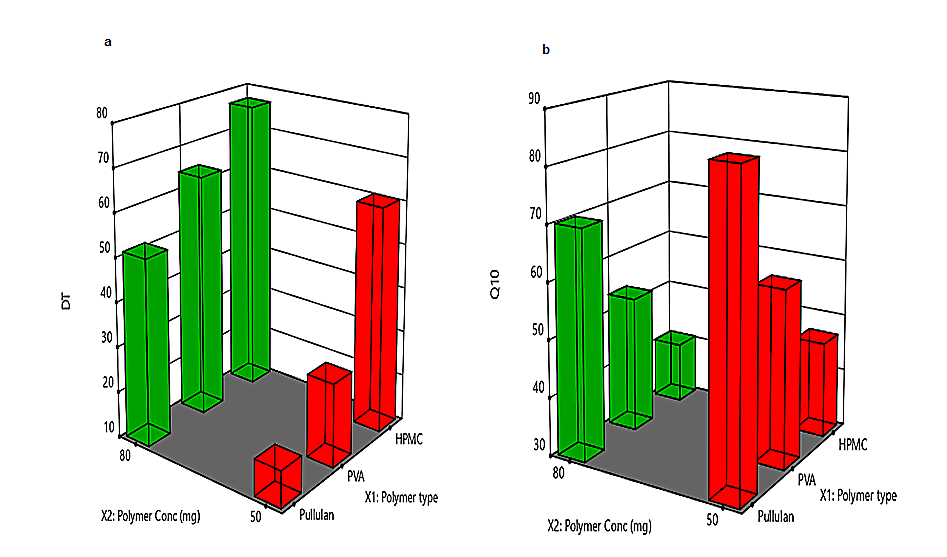 Fig. 1: 3D surface plots for the effect of polymer type (X1), polymer concentration (X2) on (a) DT and (b) Q10