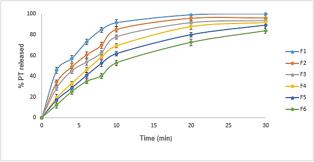 Fig. 2: In vitro release profile of PT from ODFs in SSF (pH 6.8), data are presented as mean value±SD, n=3