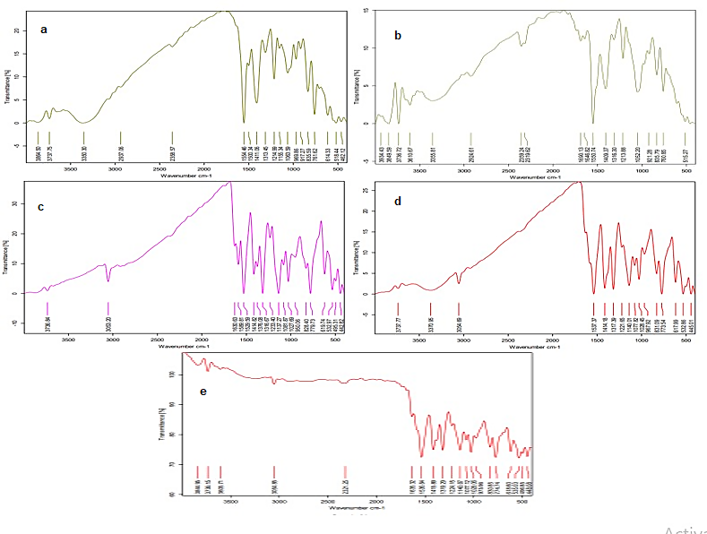 Fig. 4: Fourier transform infrared spectroscopy (FT-IR) spectra of (a) pure PT, (b) physical mixture of PT with excipients (c) pure LN, (d) physical mixture of (PT/lN), and (e) S1 formula physical mixture