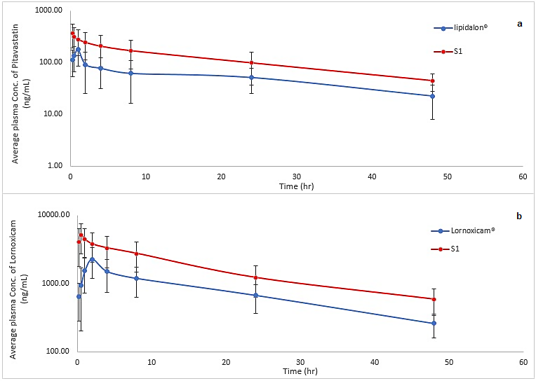 Fig. 8: Mean plasma concentration profiles of (a) PT from S1 and lipidalon®, (b) LN from S1 and lornoxicam® after oral administration, data are presented as mean value±SD, n=6