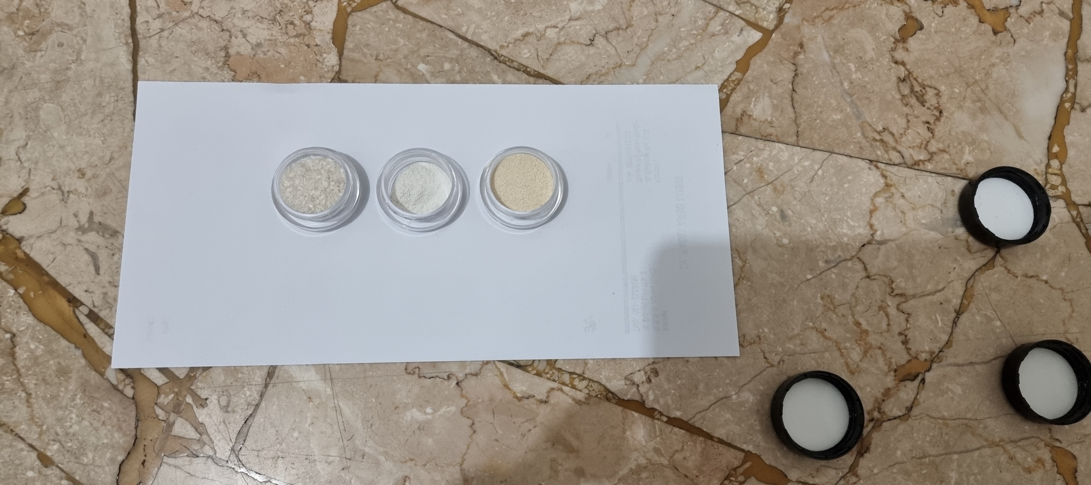 Fig. 1: Physical appearance of chitosan sourced from crab shell waste (left), chitosan sourced from crab shell waste shrimp shell waste (middle), and standard chitosan (right)