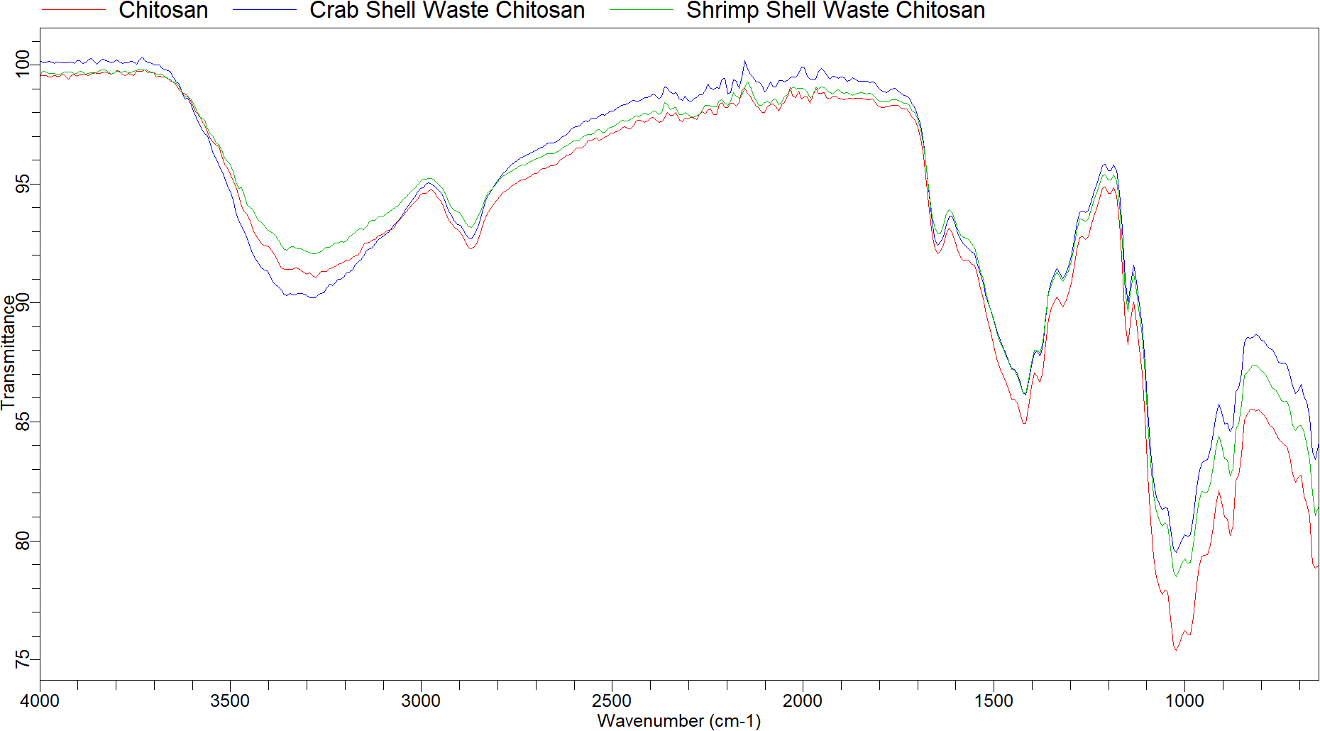 Fig. 2: Overlay infrared of spectrum chitosan sourced from crab shell waste (blue line), chitosan sourced from shrimp shell waste (green line), and standard chitosan (red line)