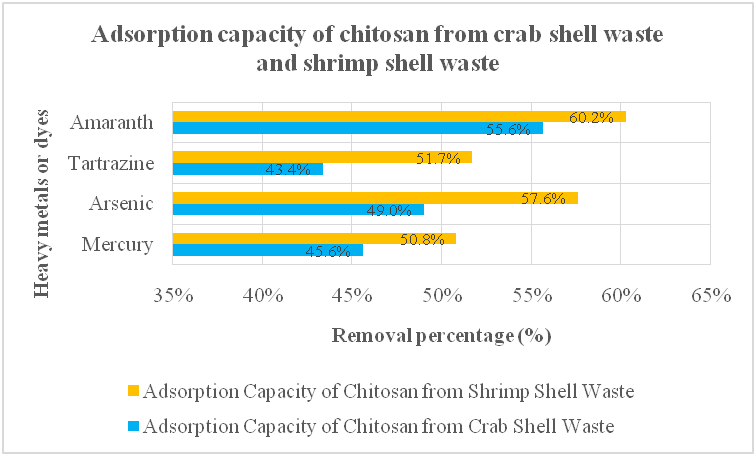 Fig. 3: Adsorption capacity of chitosan sourced from crab shell waste and shrimp shell waste against heavy metals (mercury and arsenic) and dyes (tartrazine and amaranth)