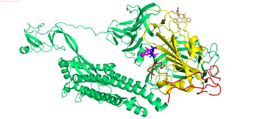 Fig. 1: Visualization complex of SARS-CoV-2 glycoprotein (PDB: 6VXX) with several ligand: Sularboins A (wheat), MLN 4760 (magenta), and caryophyllene oxide (dark blue). Location of the receptor-binding domain (RBD) is indicated by yellow color dan the receptor-binding motif (RBM) is indicated by red color (coil)