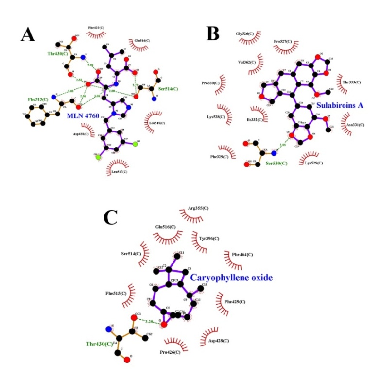 | Caryophyllene Oxide | Thr430: 3.20 Å | Phe515, Ser514, Glu516, Tyr396, Phe464, Phe429, Asp428, Pro426 |