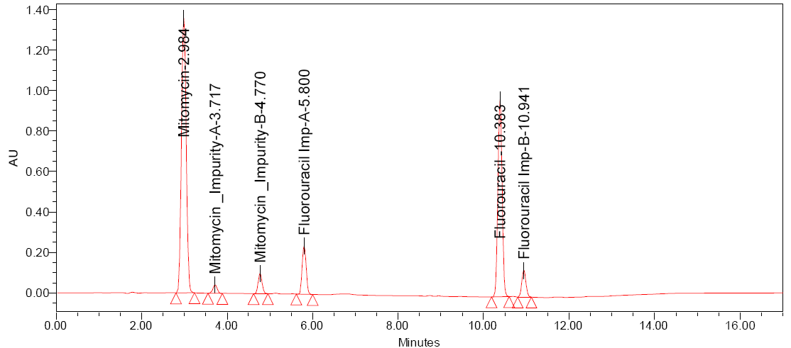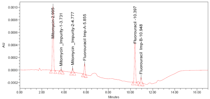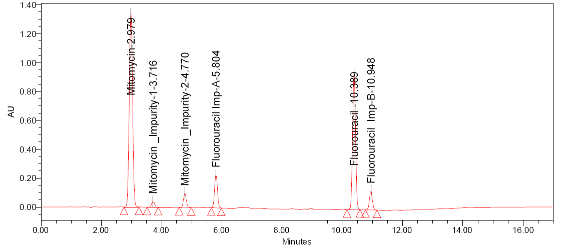 Accurately weighed and transferred5 mg of impurity-A and impurity-B of mitomycin and impurity-A and impurity-B of Fluorouracil working standards into a 100 ml clean dry volumetric flask and diluent was added and sonicated to dissolve completely and made volume up to the mark with the same solvent. 1 ml of the above solution was taken into 10 ml volumetric flask and volume was made up to the mark with diluents.