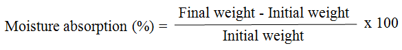The examination was carried out to check the physical stability of the prepared atenolol buccal patches at excessive humid conditions. In this study three 1 cm2buccal patches of each formulation were cut out, accurately weighed and stored in a desiccator comprising saturated solution of aluminium chloride, maintaining relative humidity of 76% within the desiccator for 3 d. After 3 d, the buccal patches were removed, reweighed, and percentage moisture absorption was calculated applying the formula [33, 34]: