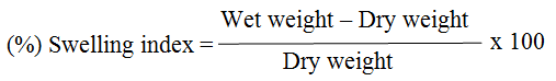 The swelling index of different buccal patch formulations were measured by the consequence of increase in weight results from swelling. For investigation of swelling index the drug loaded patches (n=3) of 1×1 cm were accurately weighed and kept in a petridish comprising 50 ml of phosphate buffer saline pH 6.8. At an interval of 1h up to 6 h theswollen patches were carefully withdrawn from the petridish, surplus water was out of the patch by filter paper, reweighed and % swelling index was obtained by the following formula [39, 40]: