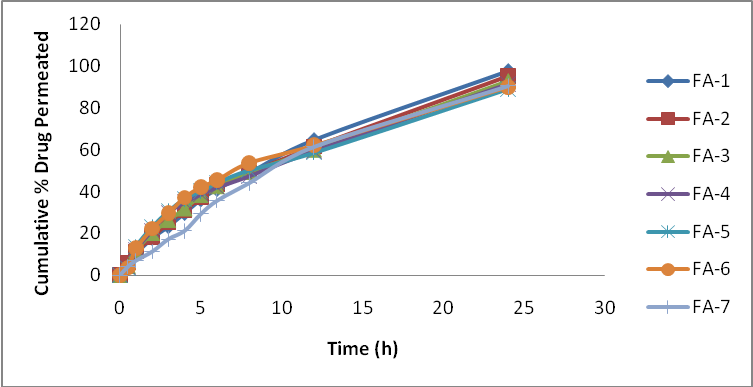 Among the Atenolol buccal patch formulations FA-1 to FA-7, the ex vivo permeation was maximum with formulation FA-1 (97.51±1.15 %) through goat buccal mucosa in 24 h and minimum with formulation FA-5 (88.89±1.12 %) as evident from table 4 and fig. 2. The drug permeation profile of formulation FA-1 to FA-7 was observed in the order of FA-1>FA-2>FA-3>FA-4>FA-7>FA-6>FA-5. The ex vivo drug permeation study demonstrated a slow and steady manner drug permeation profile. The examination revealed a better drug permeation profile observed with higher swelling of the polymers. The results of ex vivo permeation examination of atenolol reveals that atenolol easily permeated through the excised buccal mucosal membrane of goat for a period of 24 h and could possibly permeate through the human buccal membrane [53].