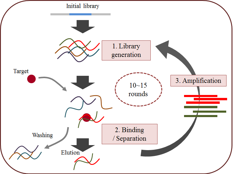 Fig. 2: Schematic representation of the SELEX in vitro selection of the Aptamer. (step 1) library generation, (step 2) binding and separation, (step 3) amplification [3]