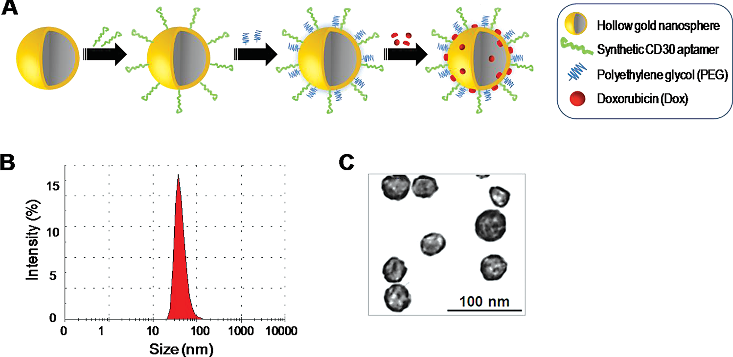 Fig. 6: schematic representation for the development of the Apt-HAuNS-DOX (a) Aptamer and PEG are conjugated over the surface of HAuNS via covalent S-Au bond followed by loading with doxorubicin by a charge force (b) indicates the peak size of formed Apt-HAuNS-DOX 42 nm measurement which is carried out by dynamic light scattering method (c) Transmission electronmicrograph of the Apt-HAuNS-Dox with scale bar [50]