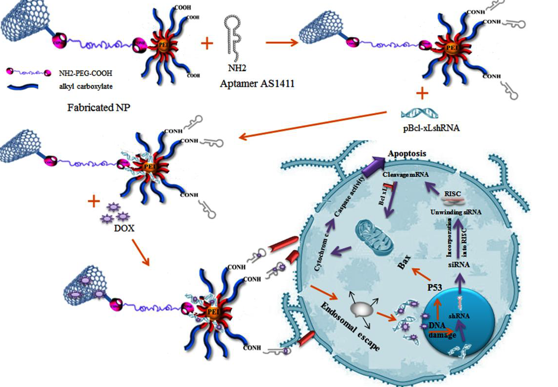 This drug delivery system was developed for the synergistic cancer cell death. This can be achieved by the target delivery system which consists of BcL-xL-specific sh RNA and along with very low level of DOX content, which parallelly activates an intrinsic apoptotic pathway. Which consists of modified branched polyethylenimine was grafted to carboxylated single walled carbon nanotube (SWNCT) through polyethylene glycol (PEG) which serves as vehicle for sh RNA delivery and the resultant conjugate i.e. (SWNCT and PEG-PEI) was attached to AS1411 Aptamer (fig. 7) through covalent attachment. The final vehicle was obtained after the inhalation of DOX with the pBcL-xL-shRNA-SWNCT-PEG-10-10%PEG-Apt. As the result, the combination of shRNA mediated gene silencing along with chemotherapeutic agent is a valuable and safe approach for antitumor activity [51].