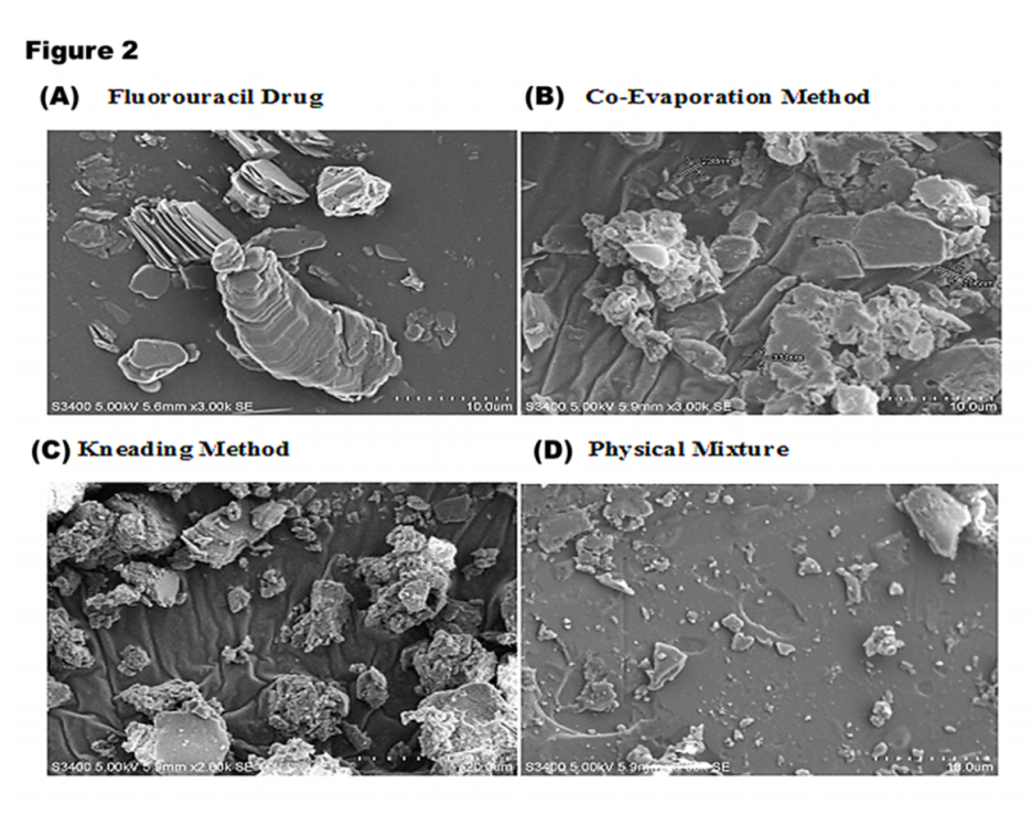 Scanning electron micrographs were performed for four different samples. This included complex formed in between 5-fluorouracil and β-cyclodextrin by physical mixture, kneading method, and co-evaporation method. All samples were analyzed under SEM, JEOL JSM 6390, England. All sample particles were coated with a thin layer of gold and preparation was dispersed over a carbon tab to render electrical conductivity [39].