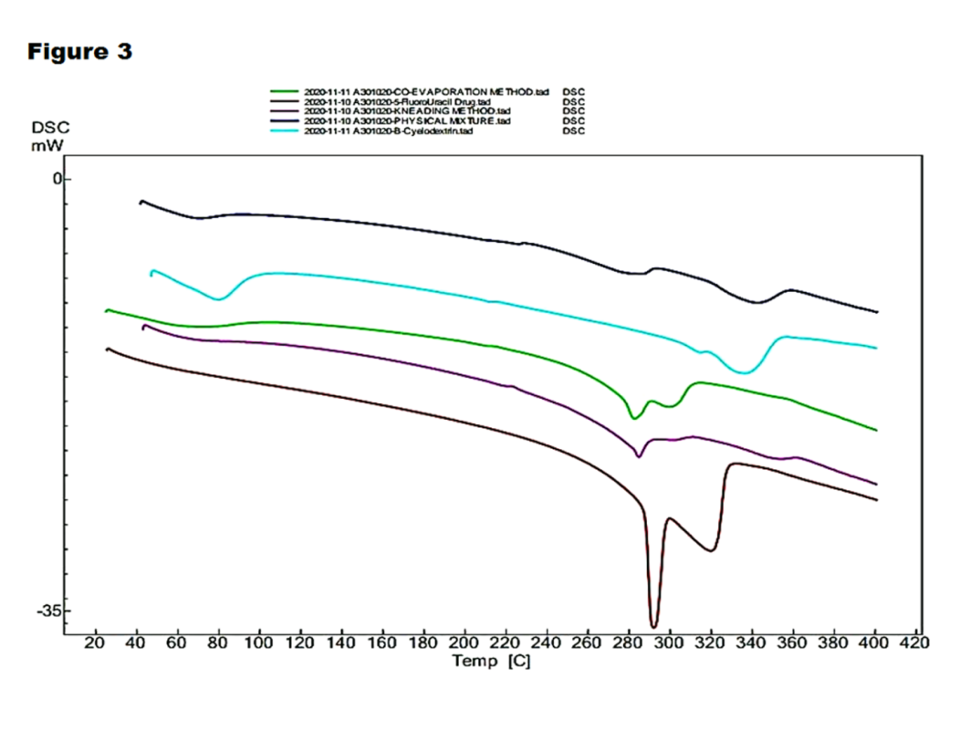 With the help of exothermic and endothermic peaks in case of DSC, we can able to notify drug excipient interaction which is obvious for any kind of formulation [23]. Here in the case of 5-fluorouracil and β-cyclodextrin complex formation shown in fig. 3, that 5-fluorouracil drugs have a sharp endothermic peak which proves that the drug is melted down at 290 °C and second endothermic peak at 340 °C proven that the drug is degraded due to high temperature. Similarly, β-cyclodextrin is also having an endothermic peak at 78 °C, which proves that stored water in cyclodextrin starts releasing out from the cavity [44]. Also, its decomposition occurs at a temperature of 320 °C as in the case of a physical mixture of 5-fluorouracil and β-cyclodextrin, it was noticed that both the endothermic peak of 5-fluorouracil and β-cyclodextrin was present at their respective places, which mean there was no variation or interaction found in physical mixture preparation, also drugs were not encapsulated in a cavity of β-cyclodextrin. As in the case of the kneading method, a minor size change in endothermic peak at 290 °C but the peak present at its original position, also the second endothermic peak lost which proves that drugs encapsulated in β-cyclodextrin and the structure of 5-fluorouracil is almost changed. In the case of the co-evaporation method; Again change in the size of the endothermic peak observed and a small shift of the second endothermic peak was noticed at 300 °C from 320 °C, this proves that the drug melting point is changed which is because of encapsulation of drug in the cavity of β-cyclodextrin.