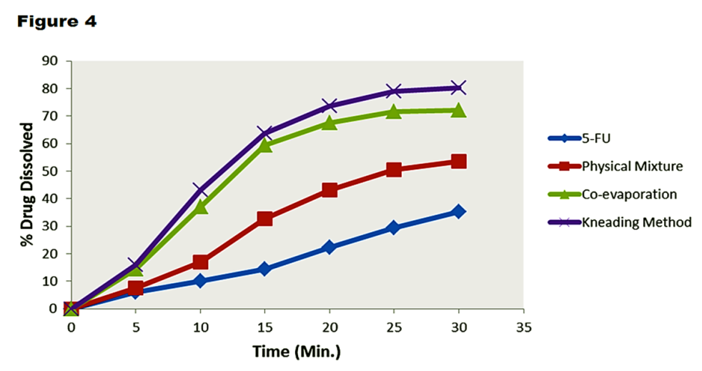 The dissolution profile of a drug (5-fluorouracil) and its different complex are reported in a given fig. 4. The release rate of 5-fluorouracil was drawn against time in minutes. This study actually shows the dissolution time of the drug and its complex in a media, which totally depends on the nature of the drugs, the inclusion complex preparation method, and media used for dissolution.