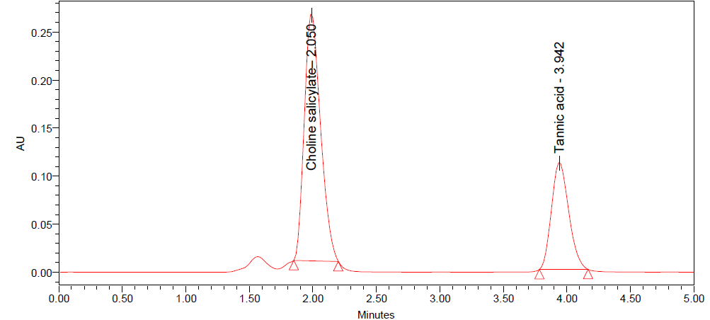 The LOD concentration for choline salicylate was 1.21 µg/ml and s/n value was 6 and tannic acid was 0.758 µg/ml and s/n value 3. The LOQ concentration for choline salicylate 4.0 µg/ml and its s/n value was 27 and tannic acid 2.5 µg/ml and s/n value was 24.