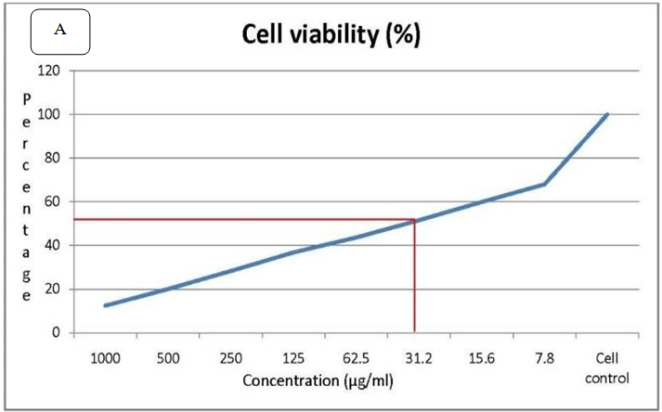 In 96-well plates (0.2 ml/well), cells were seeded at a density of 0.2105 cells/ml and incubated for 24 h. The cells were then treated for 72 h with varied dosages of AgNPs (2–30 µg/ml). MTT was added to the medium and left for an hour to incubate. After carefully removing the medium, 0.1 ml of dimethyl sulfoxide (DMSO) was added to each well and incubated for 5 min while shaking. A microplate reader was used to measure the absorbance at 570 nm. MTT was added to the medium and left for an hour to incubate. After carefully removing the medium, 0.1 ml of dimethyl sulfoxide (DMSO) was added to each well and incubated for 5 min while shaking. A microplate reader was used to measure the absorbance at 570 nm [19, 20].