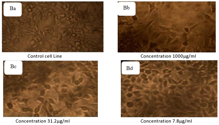 Fig. 4: Cytotoxicity results of synthesized Silver nanoparticles towards A549 cells. A) IC50value of prodigiosin silver nanoparticles at different concentration. B) Morphological study of AgNPs against A549 cells, at different nanoparticles dosage. Control cells (Ba), 1000µg/ml, 13.2 µg/ml, 7.8 µg/ml (Bb-Bd)