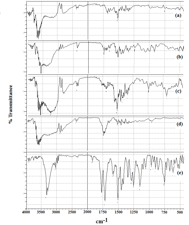 Fig. 2: FTIR spectra of: (a) gellan gum, (b) linseed gum, (c) gellan gum-linseed gum microbeads without aceclofenac, (d) gellan gum-linseed gum microbeads of aceclofenac (B-O) and (e) aceclofenac (pure)
