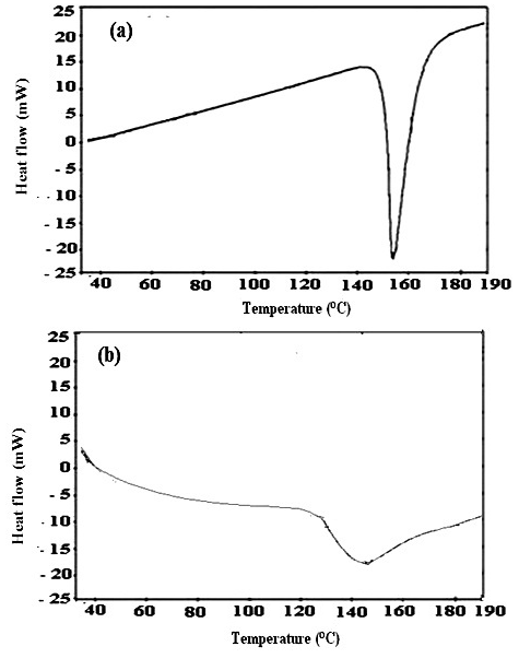 The moisture free samples (approximately 7 mg) were taken and placed inthe pan made of platinum crucible-aluminium in hermetically sealed condition and ∞-alumina powders as reference substance was employed. DSC thermograms for each tested samples were taken and analyzed in a differential scanning calorimeter (Perkin Elmer®, Japan)atthe heating rate of 10 °C/min under the constant flow of nitrogen gas(flow rate of 150 ml/min).