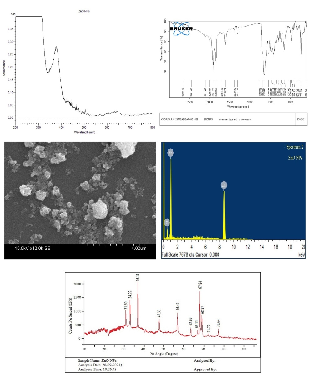 The UV-visible spectrophotometer (JASCO, Japan) was used to evaluate the optical characterization of ZnO NPs by scanning the aqueous solution of NPs in the range of 800 to 400 nm. The functional group analysis of synthesized nanoparticles was carried out using an FT-IR spectrophotometer (Bruker, USA) in the range of 500–4000 cm-1 that confirms the plant biomolecules involved in the bio-reduction of Zn to form ZnO NPs. The FE-SEM (Field emission scanning electron microscope-NOVA NANOSEM 450, FEI, USA) analysis of synthesized NPs was carried to determine morphology and size. The lattice structure and crystalline nature of the ZnO NPs were confirmed by X-ray diffraction (XRD) analysis. The XRD analysis was performed on x-ray diffractometer (Rigaku Corporation) at a scan speed of 2°/min in the diffraction angles (2θ) from 20° to 80°. The % metal content and the elemental composition in the synthesized ZnO NPs were confirmed by EDS (Energy-dispersive X-ray spectroscopy) studies carried on RONTEC’s EDX system (QuanTax 200, Germany).
