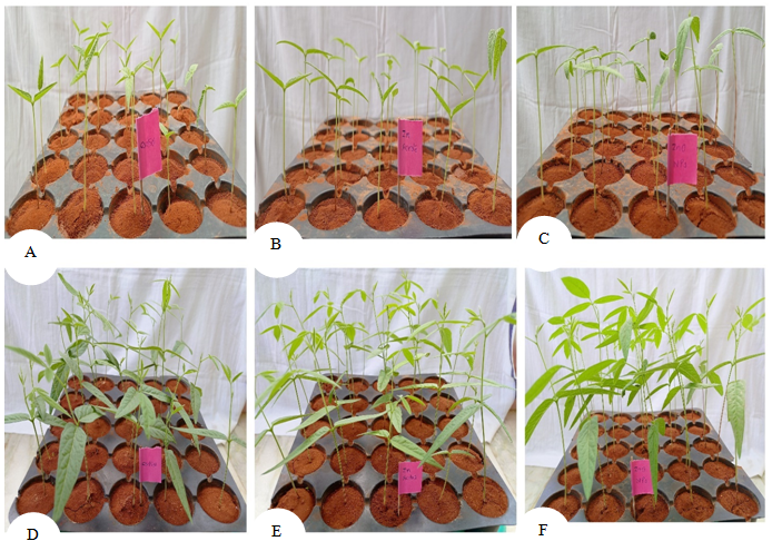 Fig. 3: Pictorial view of pigeon pea plants in growth promotion activity study, plant growth observed for untreated (A), Zn acetate treated (B) and ZnO NPs treated (C) pigeon pea seeds 3rd day of germination study. Plant growth observed for untreated (D), Zn acetate treated (E) and ZnO NPs treated (F) pigeon pea seeds 8th day of germination study