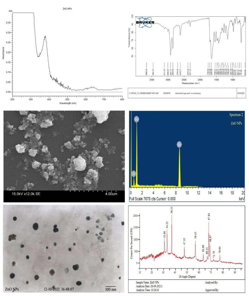 The ZnO NPs were characterized for its optical characteristics (UV-visible spectrophotometer; JASCO, Japan), shape (Field emission scanning electron microscope-NOVA NANOSEM 450, FEI, USA), crystal nature (x-ray diffractometer; Rigaku Corporation, Japan), elemental composition (RONTEC’s EDX system; QuanTax 200, Germany), topography (Transmission Electron Microscope; Jeol/JEM 2100, Japan) and the bioactive functional groups responsible for the formation of NPs (FT-IR spectrophotometer; Bruker, USA).