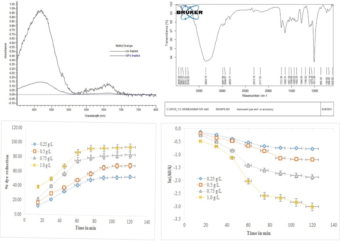 Fig. 3: Photocatalytic degradation of methyl orange dye using ZnO NPs synthesized using S. swietenioides leaf extract, the results presented in graphs (C and D) were the mean±SD of three replicate experiments, A) Temporal evolution of the absorption spectra of 50 ppm methyl orange aqueous solution at 0 h and 2 h in the presence of ZnO nanoparticles; B) FT-IR spectrum of methyl orange treated ZnO NPs showing the functional groups corresponds to methyl orange dye; C) The photodegradation time profile with different strengths of ZnO NPs on the reduction of methyl orange dye at a concentration of 50 ppm; D) The photodegradation time profile of A t/A 0 for 10 ppm methyl orange dye concentration treated with various strengths of photocatalyst (ZnO NPs)