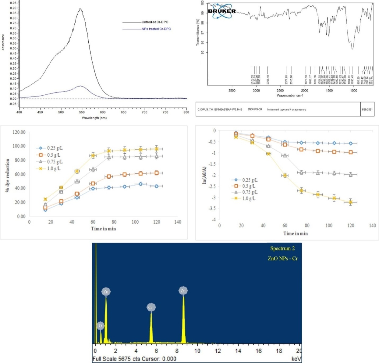 Fig. 4: Photocatalytic degradation of methyl orange dye using ZnO NPs synthesized using S. swietenioides leaf extract, the results presented in graphs (C and D) were the mean±SD of three replicate experiments, A) Temporal evolution of the absorption spectra of 50 ppm chromium metal solution treated with diphenyl carbazide at 0 h and 2 h in the presence of ZnO nanoparticles; B) FT-IR spectrum of chromium treated ZnO NPs showing the reduced intensity of functional groups due to blockage of chromium metal when compared with untreated ZnO NPs; C) The photodegradation time profile with different strengths of ZnO NPs on the reduction of chromium metal at a concentration of 50 ppm; D) The photodegradation time profile of A t/A 0 for 50 ppm chromium metal concentration treated with various strengths of photocatalyst (ZnO NPs); E) EDS spectra of chromium metal treated ZnO NPs shows peak corresponds to chromium metal