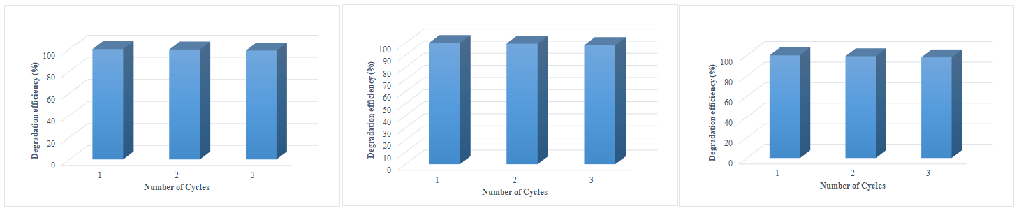 The recyclability of the photocatalyst treated with both dyes crystal violet, methyl orange and chromium metal was evaluated in three photocatalysis process. After three cycles of study, the photocatalytic efficiency was observed to be 98.71 %, 98.27 % and 98.06 for methyl orange, crystal violet and chromium metal, respectively (fig. 5). The results confirm that after three cycles of study, there is the negligible decline in the photocatalytic degradation efficiency for both dyes and metal in the study.