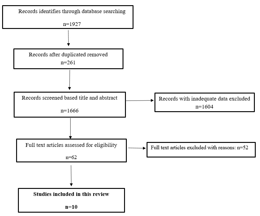 Totally 1927 papers were identified by database searching. Out of these papers, 261 papers were discarded because of duplication. Of the remaining 1666 papers, 1604 papers were discarded because of the inadequate information and the ones in which the abstract was submitted in congresses as preceding papers, conferences, and editorials without full text. Out of the remaining 62 papers which were studied for eligibility, 52papers were removed for a number of reasons, including inconsistency between methods with results, incorrect interpretation of the results, poor methodology, etc. Finally, 10papers were included in this present study (fig. 1). The results of a review of studies on the ability to differentiate PC from benign prostatic lesions, including prostatitis and benign prostatic hyperplasia, are shown in table 1.