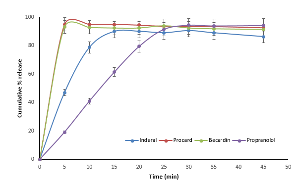 Cumulative % drug release patterns of PPL in marketed products were plotted against time. Fig. 2 demonstrates the release profiles of Inderal, Procard, Becardin and Propranolol. All conventional tablets of PPL revealed cumulative % release of more than 80% within 15 min. Propranolol and Inderal exhibited a cumulative release of 19% and 47% within 5 min, respectively. On the other hand, Procard and Becardin demonstrated a cumulative release of more than 92% within 5 min. This variation in release behaviour of PPL from these commercial tablets may be attributed to the excipients contained in the tablets where some of these excipients may act a disintegrants and enhance dissolution rate while others may act as dissolution retardants for example, lubricants in high amounts [20, 21]. In vitro comparative dissolution profiles of different propranolol, generic tablets available in Bangladesh were studied. Shuma ML et al. (2021) have tested four different products of propranolol 10 mg tablets. All four local products had a suitable dissolution pattern with the reference brand (at least 80% of the propranolol was dissolved in the medium after 30 min) [22].