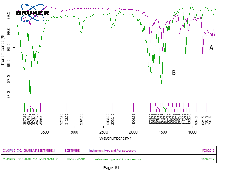 Fig. 1: Drug excipients compatibility studies-FTIR studies of (A) Ezetimibe pure drug and (B) Optimized ezetimibe PN