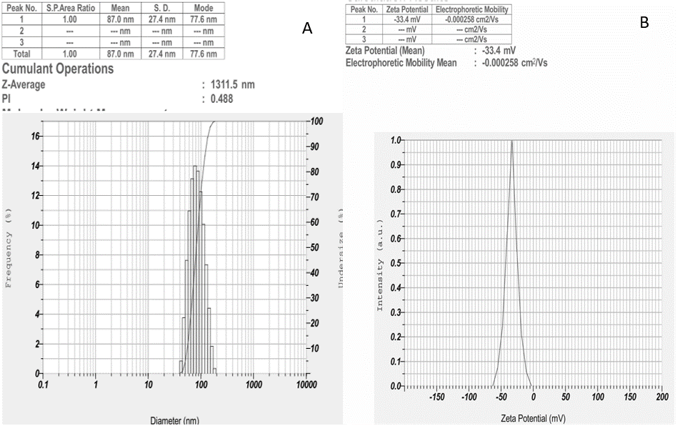 The Horiba Nanoparticle size analyzer was used to measure the Zeta Potential, or surface charge potential (SZ-100 nanopartica series). An electrophoretic cell with an 80 mV electric field was used to transport the diluted polymeric nanoparticles into the probe. At 25 °C, all measurements were made in triplicate. The amplitude of zeta potential polymeric nanoparticles should be>30mV, indicating the colloid's durability. Using the Smolochowski equation, the Zeta potential was then directly calculated from the equation [23].