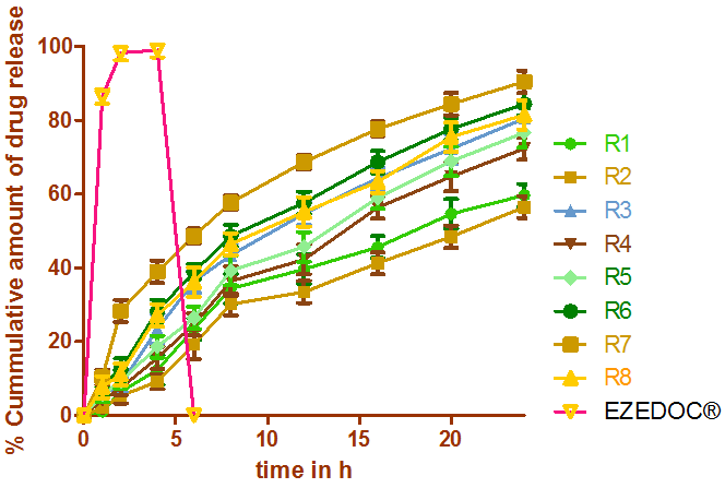 The In vitro drug release studies for all the polymeric nanoparticle formulation was carried out in pH 7.4 phosphate buffer by using dialysis membrane technique. The percentage amount of drug released through dialysis membrane for each formulation was found to be in the range of 54.46±3.04% to 90.42±3.12% in 24 h as shown in fig. 7. By comparing all the formulations, the formulation R7 shows desired drug release based upon the concentration of drug, polymer and enhanced entrapment efficiency due to reduction in particle size. As demonstrated in fig. 7, in vitro drug release studies for the Ezetimibe PNs (R7) formulation revealed a better-controlled drug release i.e., 90.42±3.56 percent in 24 h when compared to all other formulation and marketed Ezetamibe tablet (EZEDOC® 20). From the results it was observed that, R7 polymeric nanoparticle showed better control of drug release in a cumulative release pattern. In general the drug release from R7 formulation showed a predetermined controlled release which obeys zero-order drug release pattern [27-31].
