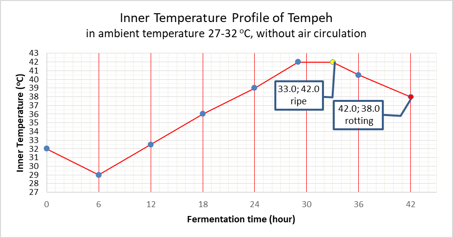 Without good air circulation, fermentation at an ambient temperature of 27-32 °C (condition a) caused tempeh too hot even up to 42 °C and rotted rapidly (fig. 1). At the 42nd h of fermentation, the tempeh showed signs of decay, marked by the smell of ammonia, brown spots, and softer texture, then the fermentation was stopped.