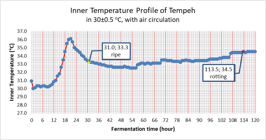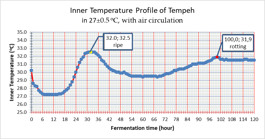 When fermented at 27±0.5 °C with air circulation (condition b), the inner peak temperature was 32.5 °C reached at the 32nd hour as well as the time for tempeh to ripe (fig. 2). With controlled temperature and air circulation, the inner temperature profile of tempeh has a parabolic-like pattern, especially at the time range for tempeh ripening. Rotting started at the 100th hour with an inner temperature of 31.9 °C.