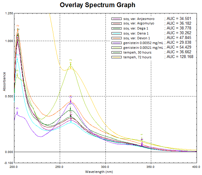 Fig. 5: Overlay Uv-spectra of soybean extract, tempeh extract, and genistein. (Area under the curve (AUC) were counted manually from the spectrum, using the trapezoid method)