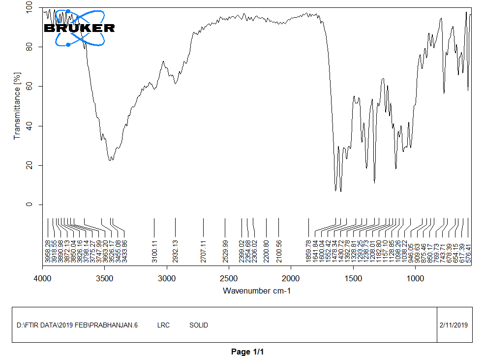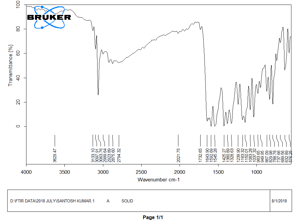 The compatibility and interaction between drug and excipients utilized in the preparation of in situ gels are assessed by using FTIR-spectrophotometer. IR spectra of lornoxicam and excipients are determined and scanned at the range of 500 to 4000 Cm-1 [13]. Results are given in fig. 2.