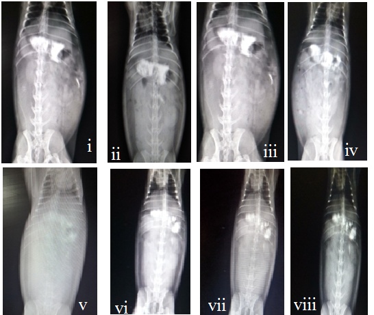 Fig. 4: In vivo X-ray images showing the presence of optimized formulation in the stomach region of the rabbit at i) 0h ii) 1h iii) 2h iv) 4h, v) 6h, vi) 8h, vii) 10h viii) 12 h