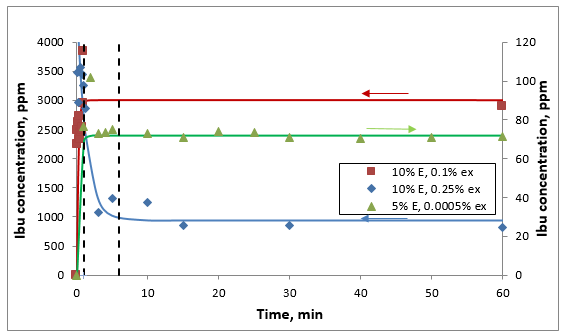 Fig. 1: Studies of Ibu equilibrium attainment for two dissolutions and one crystallization (falling curve) in aqueous ethanol with excipients